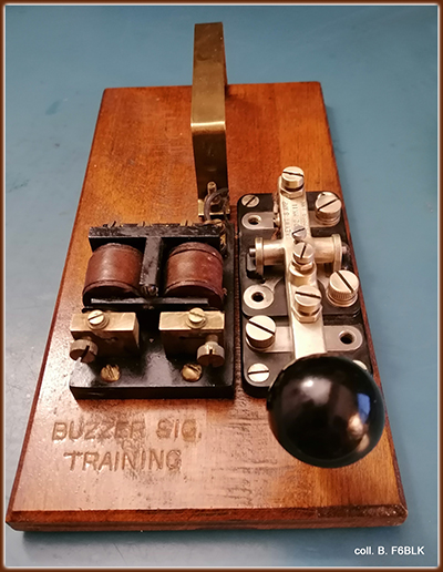 Equipé d'un manipulateur WT 8 amp N°2 MK II ZA 2889 d'un buzzer à deux enroulements et d'un porte piles, montés sur un support en bois.